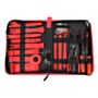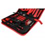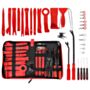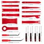 W zestawie ściągaczy do tapicerki znajduje się wiele elementów – oprócz 12 ściągaczy do tapicerki są tutaj również szczypce do spinek, łapki do spinek (22,5 i 31 cm), a także wyjmaki do radia, 11 kluczy do pinów i haki do ściągania uszczelek.