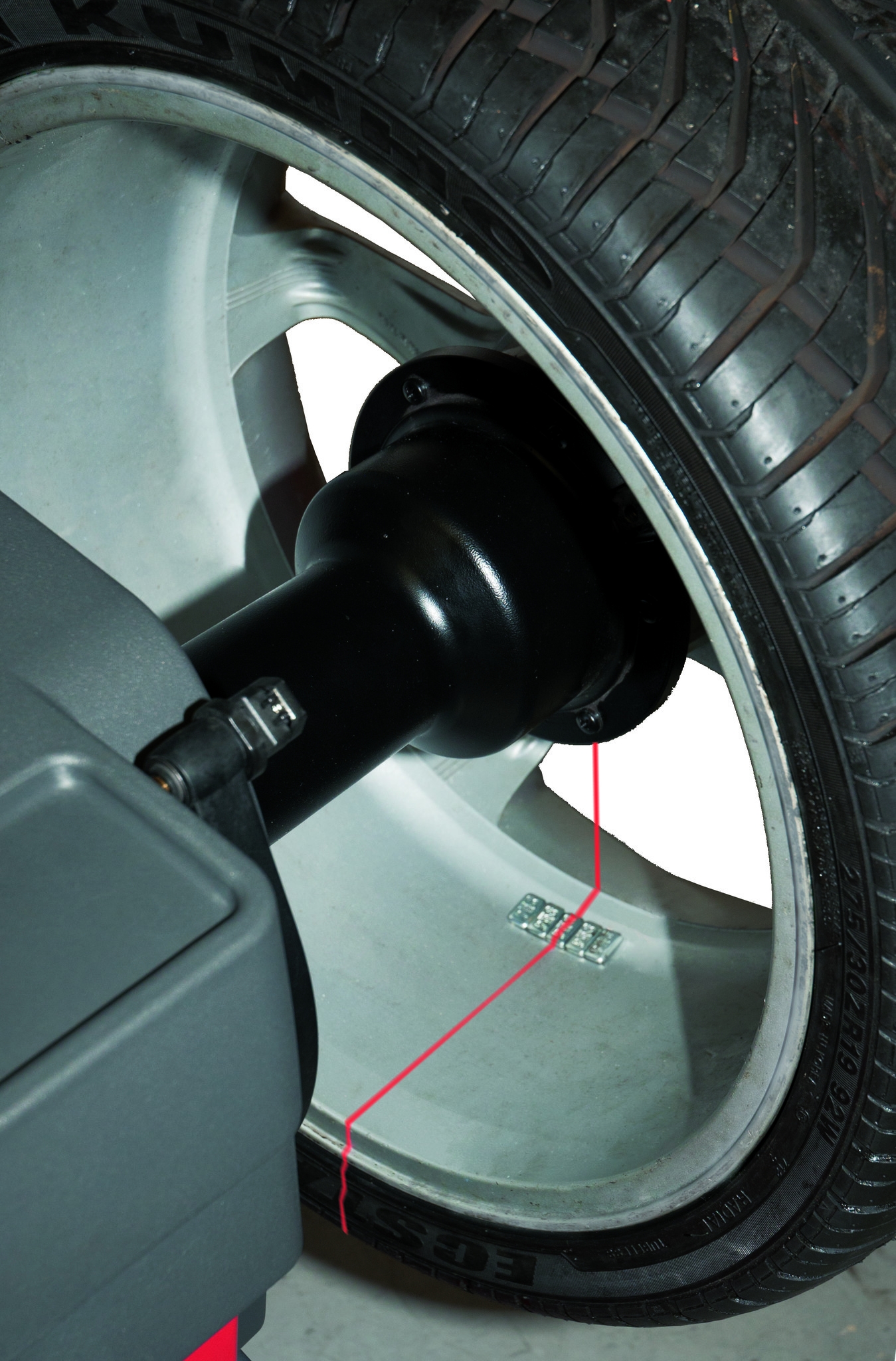 Laserowy wskaźnik dokładnie określa miejsce naklejenia ciężarka na godzinie 6.